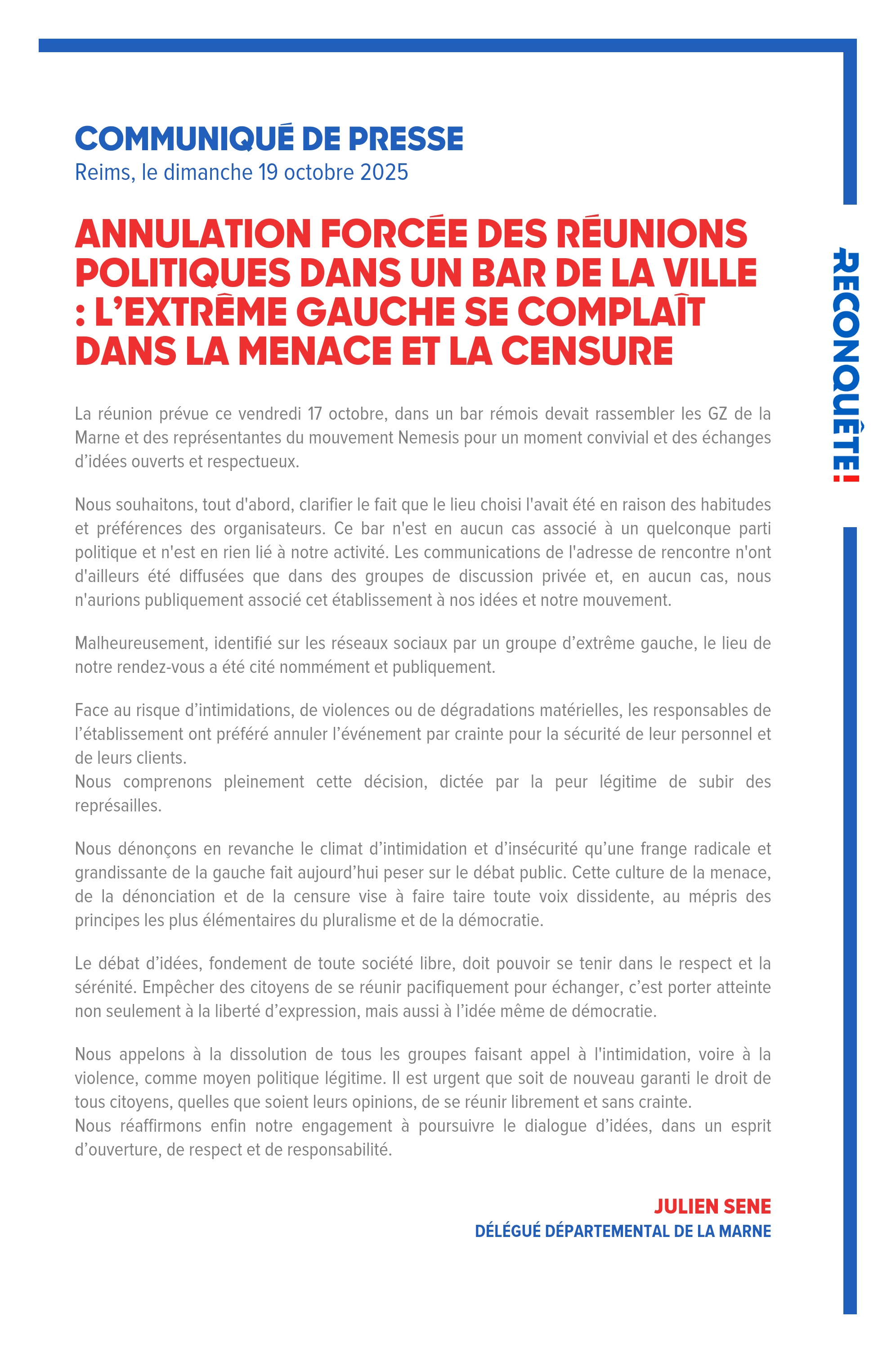 La réunion prévue ce vendredi 17 octobre, dans un bar rémois devait rassembler les GZ de la Marne et des représentantes du mouvement Nemesis pour un moment convivial et des échanges d’idées ouverts et respectueux.