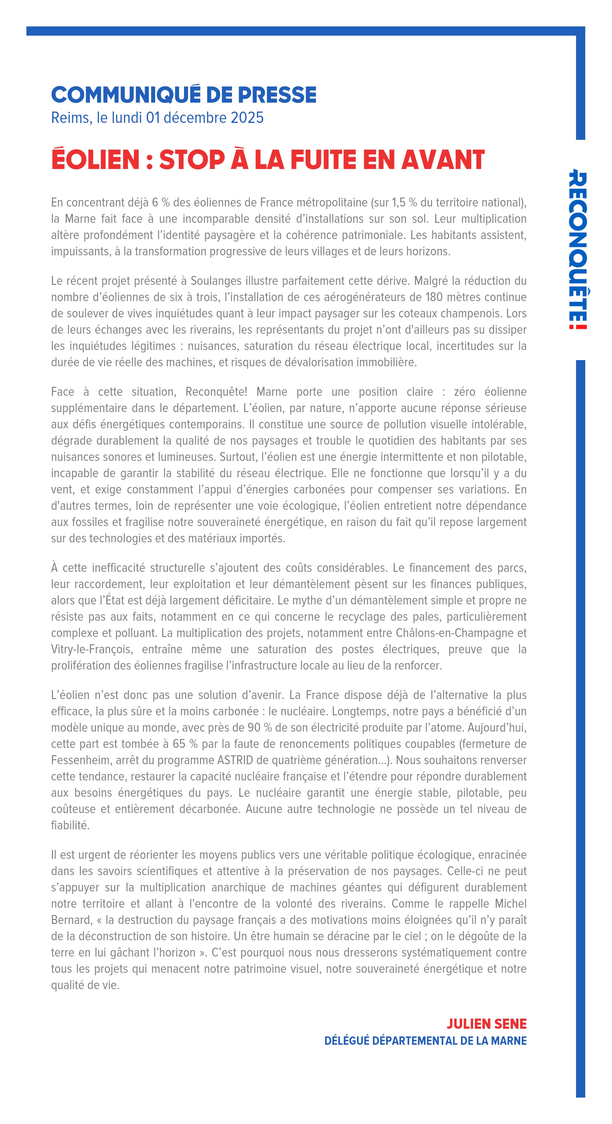 Face à cette situation, Reconquête! Marne porte une position claire : zéro éolienne supplémentaire dans le département. L’éolien, par nature, n’apporte aucune réponse sérieuse aux défis énergétiques contemporains. Il constitue une source de pollution visuelle intolérable, dégrade durablement la qualité de nos paysages et trouble le quotidien des habitants par ses nuisances sonores et lumineuses. Surtout, l’éolien est une énergie intermittente et non pilotable, incapable de garantir la stabilité du réseau électrique. Elle ne fonctionne que lorsqu’il y a du vent, et exige constamment l’appui d’énergies carbonées pour compenser ses variations. En d'autres termes, loin de représenter une voie écologique, l’éolien entretient notre dépendance aux fossiles et fragilise notre souveraineté énergétique, en raison du fait qu’il repose largement sur des technologies et des matériaux importés.