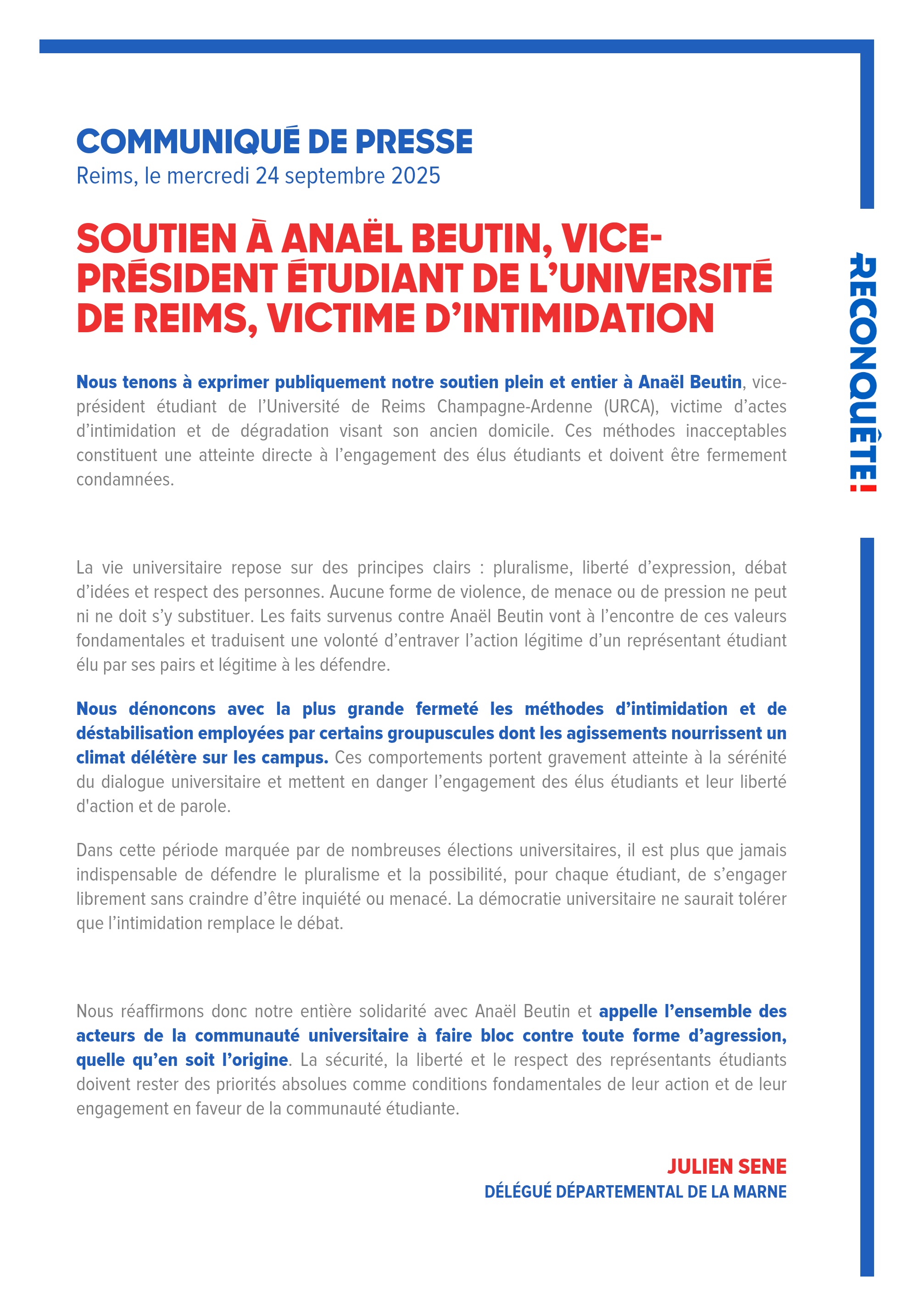 Nous tenons à exprimer publiquement notre soutien plein et entier à Anaël Beutin, vice-président étudiant de l’Université de Reims Champagne-Ardenne (URCA), victime d’actes d’intimidation et de dégradation visant son ancien domicile. Ces méthodes inacceptables constituent une atteinte directe à l’engagement des élus étudiants et doivent être fermement condamnées.